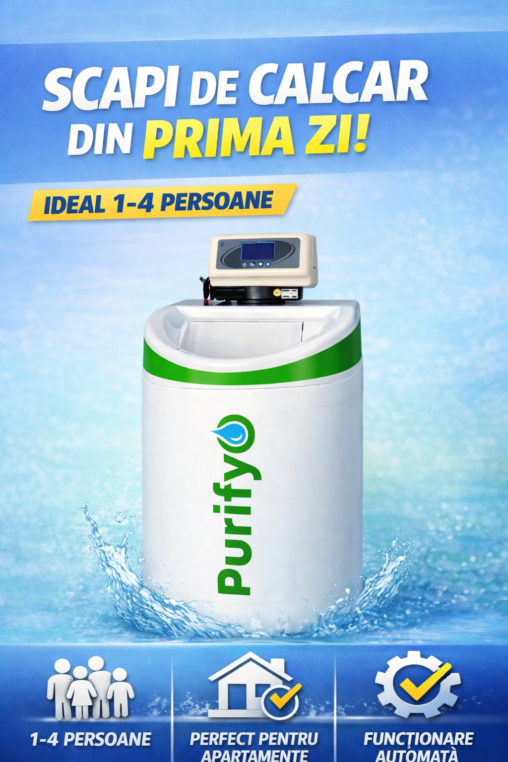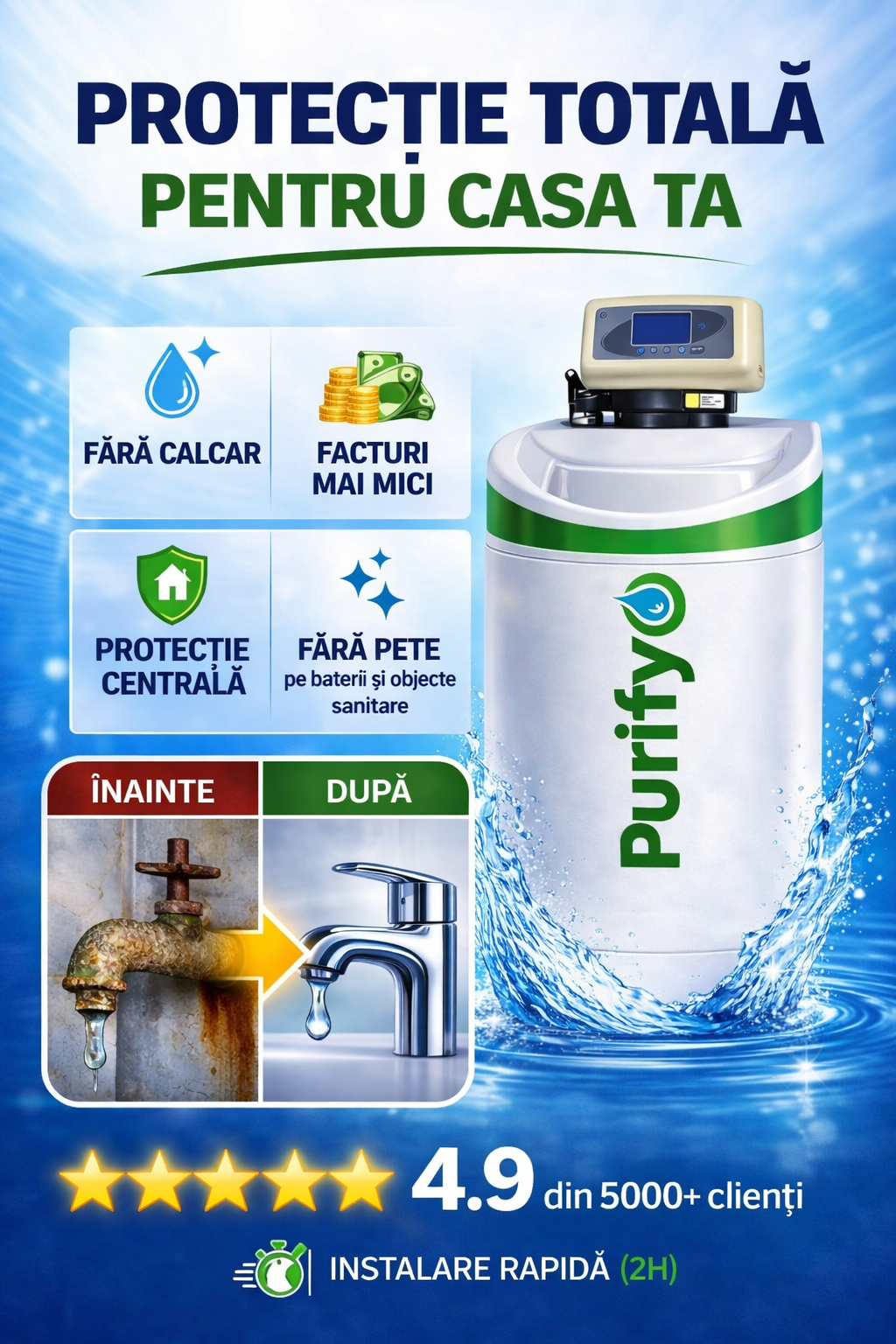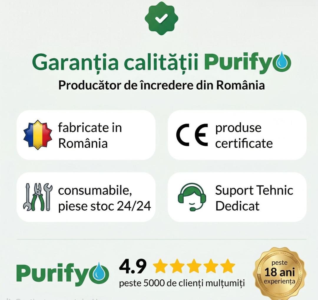 - ATENTIE! Acest sistem poate functiona pentru maxim 2 robineti deschisi simultan – pentru mai multi robineti alegeti modelul Dedurizator Purifyo SDP 26 l