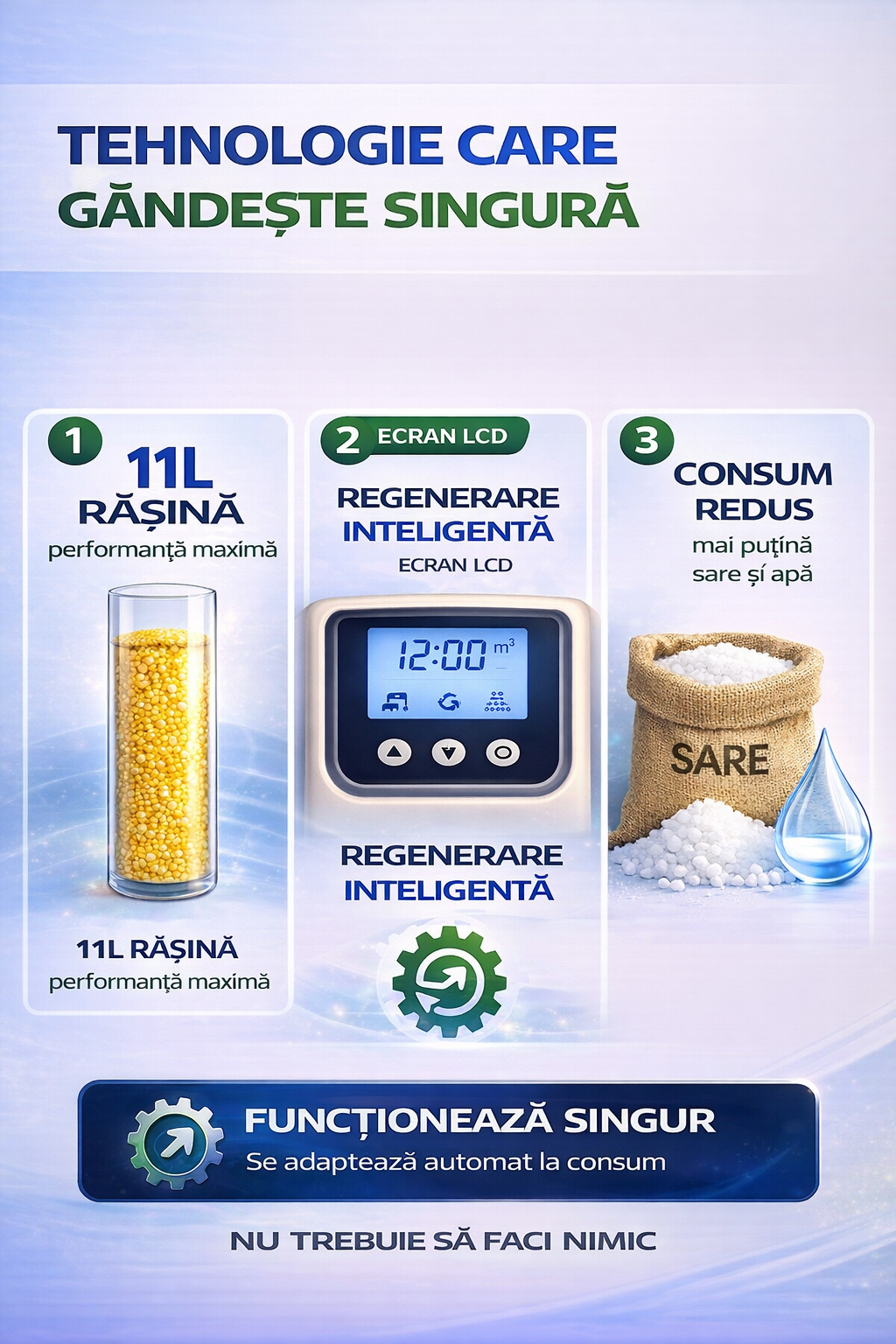 - Regenerarea volumetrica optimizeaza consumul de sare si de energie, aceasta raportandu-se direct la volumul de apa consumat